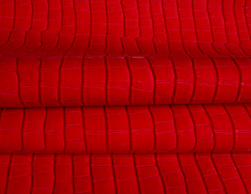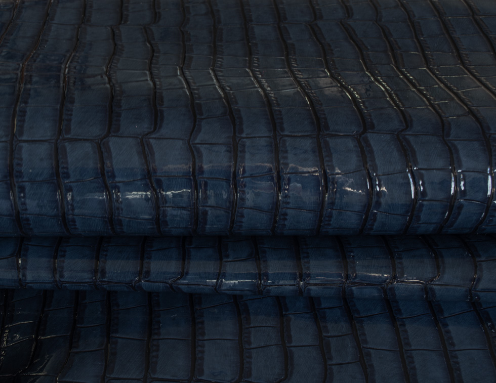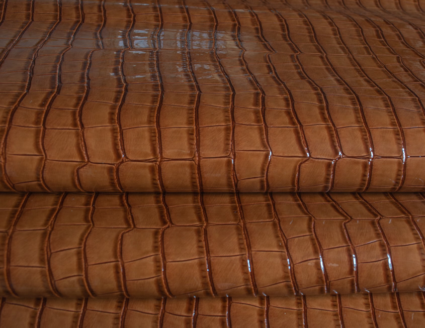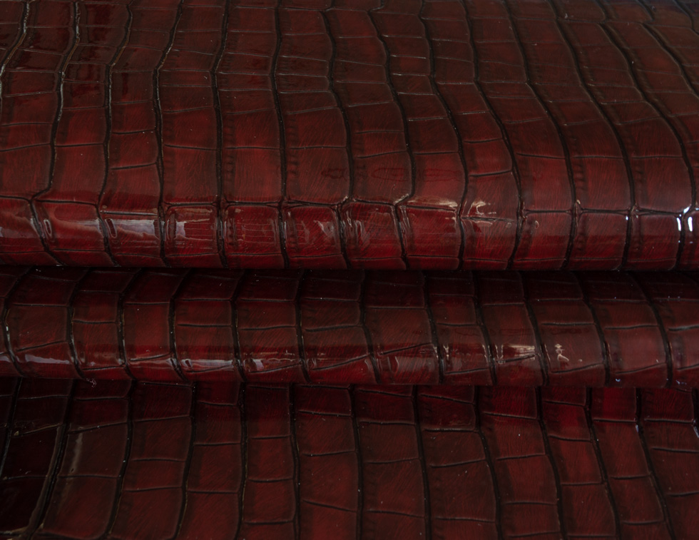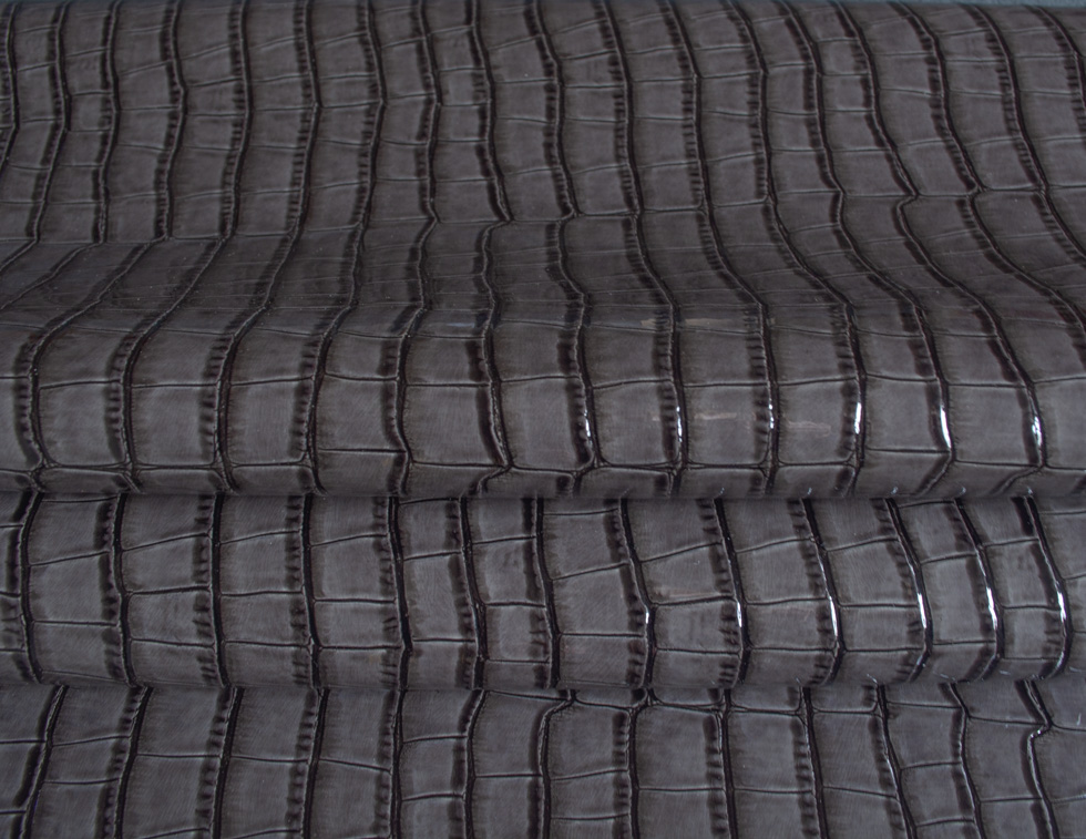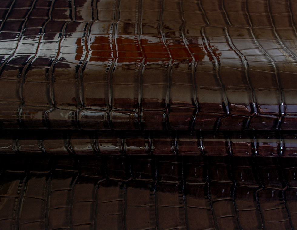 Rocco to tkanina lakierowana powlekana poliuretanem. Faktura to odciskany na błyszczącym lakierze, grubo tłoczony wzór gadziej skóry, wyczuwalny pod palcami. Materiał jest miękki w chwycie i nierozciągliwy. Rocco ma właściwości wodoodporne.