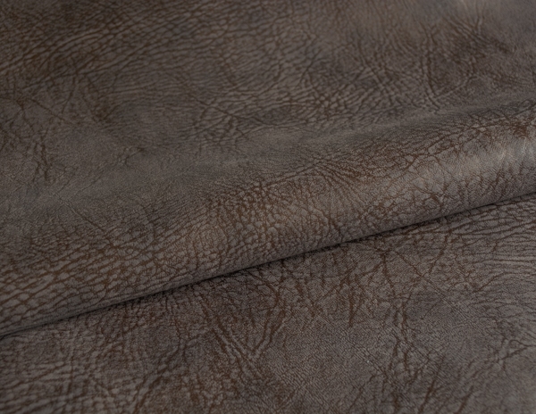Stress EV to brązowy materiał powlekany poliuretanem. Faktura jest tłoczona żyłkowanym wzorem, delikatnie wyczuwalnym pod palcami. Licem przypomina naturalną skórę w połączeniu z walorami nubuku.